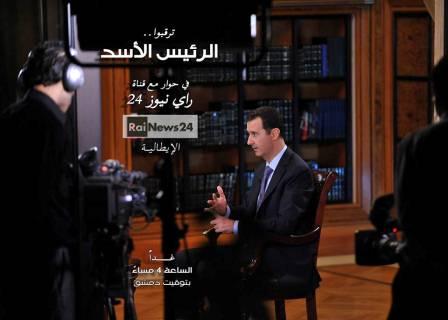 يطل السيد الرئيس بشار الأسد في لقاء تلفزيوني مع قناة راي نيوز 24 الإيطالية يبث عند الساعة الرابعة من بعد ظهر اليوم الأحد بتوقيت دمشق يتناول فيه أهم المستجدات والتطورات المحلية والإقليمية والدولية و الاتفاق الأممي حول الترسانة الكيميائية السورية والتحضيرات لمؤتمر جنيف 2.