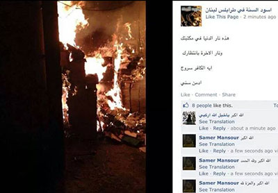 أفاد مراسل قناة "الجديد" اللبنانية في طرابلس أن مجهولين أضرموا النار بمكتبة السائح العائدة للأب سروج في شارع الراهبات بطرابلس. وقد حضرت عناصر الدفاع المدني وسرية إطفاء طرابلس لإخماد الحريق، كما حضرت دورية لقوى الامن الداخلي وفتحت تحقيقا بالحادث.