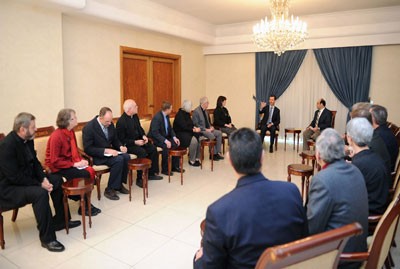 استقبل السيد الرئيس بشار الأسد اليوم وفد الكنيسة الإنجيلية الذي يضم قساوسة من الولايات المتحدة والسويد وسويسرا ولبنان وسورية والمشارك في ملتقى الكنيسة في سورية ولبنان برئاسة أمجد ببلاوي رئيس دائرة الشرق الأوسط في الكنيسة المشيخية في الولايات المتحدة.
