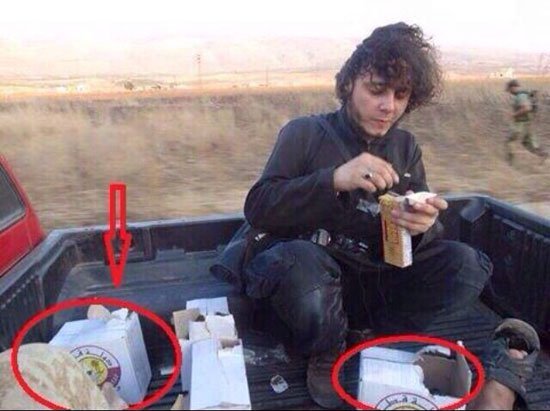 تداول نشطاء على مواقع التواصل الاجتماعى، صورة لأحد المقاتلين المنتمين لتنظيم داعش وهو يجلس داخل إحدى السيارات ويتناول وجبة غذائية مكتوب عليها "دولة قطر".