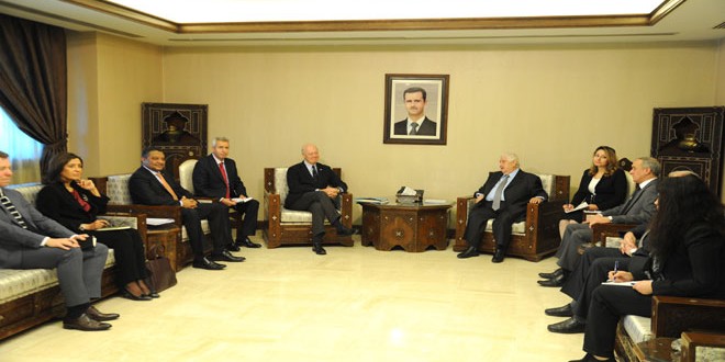 وقدم المبعوث الدولي خلال لقائه المعلم عرضاً حول اجتماع جنيف الأخير الذي تمّ تعليقه، والعمل على إطلاق المحادثات بين الحكومة السورية والمعارضات في الجزء الأخير من شهر شباط/ فبراير الجاري. كما استعرض ما جرى في اجتماع المجموعة الدولية لدعم سوريا في مؤتمر ميونيخ الأخير والجهود لتطبيق ما صدر عنه وبياني فيينا وقرارات الأمم المتحدة المتعلقة.