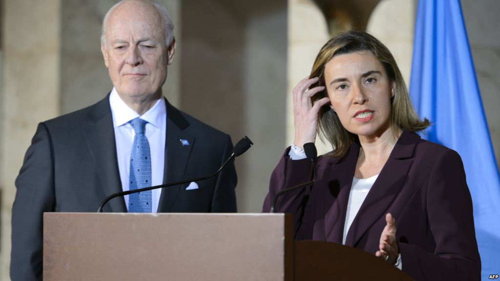 بحثت فيديريكا موغيريني مفوضة الاتحاد الأوروبي مع المبعوث الأممي إلى سوريا ستيفان دي ميستورا تطورات الأزمة السورية، وشددا على ضرورة منع "هجوم الجيش السوري على إدلب".