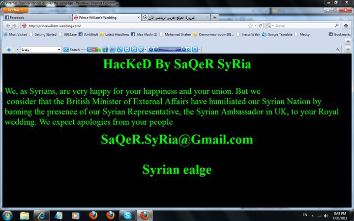 " الهاكر" الذي عرف عن نفسه باسم " صقر سورية " قام باختراق موقع لحفل زفاف الأمير البريطاني، وترك رسالة باللغة الانكليزية، على الصفحة الرئيسية للموقع، طالب من خلالها بأن يعتذر الشعب البريطاني عن سحب الدعوة لسوريا.