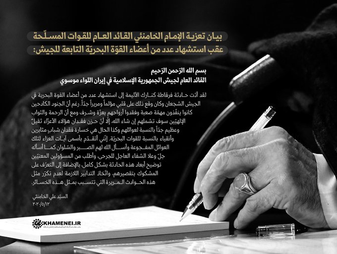 علق المرشد الأعلى في إيران، آية الله علي خامنئي، مجددا على حادثة الفرقاطة "كنارك" خلال التدريبات البحرية بخليج عمان، لافتا إلى أن وقعها على قلبه كان مؤلما ومريرا جدا.
