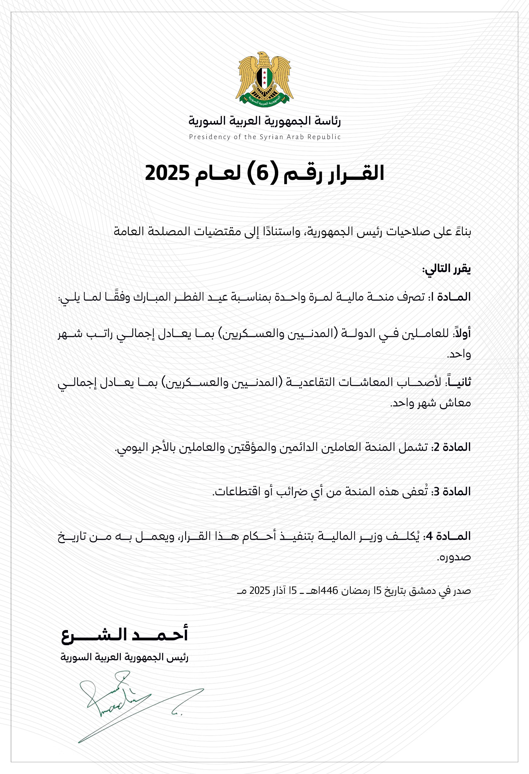 السيد أحمد الشرع القرار رقم (6) لعام 2025 الذي ينص على صرف منحة مالية