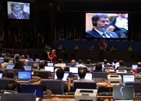 وقال مرسي خلال تسليمه رئاسة حركة عدم الإنحياز التي كانت تتولاها بلاده إلى إيران "يجب علينا أن نسعى لتحقيق مطالب ثورة سورية"، وأشار إلى أن مصر "بعد الثورة عازمة على أن تكون طرفاً دولياً فاعلً".