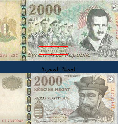 وكشف التيار أن: الورقة التي تم تداولها في الإعلام لا يمكن أن تكون طبعت في روسيا، فمن ينظر بإمعان إلى العملة المزيفة، يرى أن فوق " Syrian Arab Republic" يوجد كلمة "budapest" التي هي عاصمة المجر (هنغاريا) ، ومن هنا وبعد النظر إلى العملة المجرية من فئة "2000"، نتعجب من التشابه الفاضح بين العملة المزيفة السورية والعملة المجرية (الصورة مرفقة أدناه).