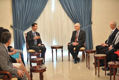 وأكد الرئيس الأسد خلال اللقاء أن ما يحدث في سورية خصوصا وفي المنطقة عموما يتأثر به العالم برمته لأن ما تواجهه البلاد من فكر تكفيري متطرف هو إرهاب لا حدود ولا وطن له .. هو آفة دولية يمكن أن تضرب في أي زمان ومكان.