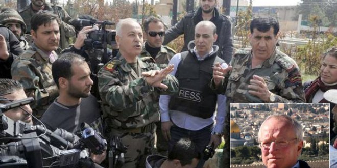 جنود سوريون – جنباً إلى جنب مع مجموعة من مقاتلي حزب الله من لبنان – شاهدوا الجنرال بادي علي يرفع العلم السوري يوم الاثنين، بعد فوات الأوان على إنقاذ جداريةٍ جميلةٍ في أقدم كنيسةٍ في سورية، كان قد غيّر معالمها رجال جبهة النصرة والجبهة الإسلامية.