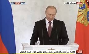 2 ـ استطاع القيصر بوتين أن يخلق «فكرته الكبرى» في جمع الناس معاً تحت شعار «إعادة الوحدة الوطنية للروس» وإعادة جمعهم تحت ما يسمى بالاتحاد السوفياتي، مبدياً تحدياً وهجوماً قويين غير مسبوقين بالخطب الرئاسية، إذ أعلن صراحة: إن أردتموها حرباً فاهلاً وسهلاً بالحرب، موجهاً انتقادات حادة ولاذعة إلى من أسماهم بشركائه الغربيين إذ قال: «لسبب غير معروف، ما يسمح به لألبانيين كوسوفو ونحن نحترمهم يحرم على الروس والأوكرانيين والتتار في القرم! عندما استهدفت بلغراد بالقنابل والصواريخ، الأمر الذي أعقبه تدخل حقيقي، هل كان هناك قرار من مجلس الأمن في هذا الشأن يجيز مثل هذه الأعمال؟ لا شيء من ذلك. ثم كانت أفغانستان والعراق وقرارات مجلس الأمن التي انتهكت صراحة في ليبيا حيث بدلاً من تأمين منطقة تسمى حظراً جوياً بدأ أيضاً في القصف. إنها ليست حتى سياسة الكيل بمكيالين، بل هي وقاحة مثيرة للدهشة».