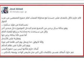هذا وقالت جود: 'حازم اعتدى عليّ جسديا مع محاولة اغتصاب أمام جموع المصفقين من عرب الجوار، بمساعدة من مؤيد سكيف، وهو بحالة سكر'.