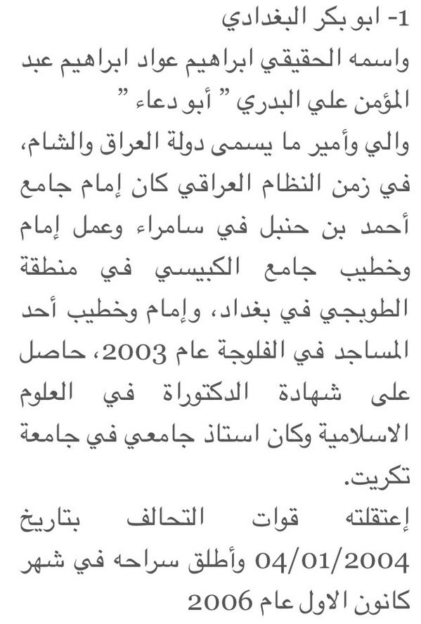 ويَنسب البغدادي نفسَه إلى الخليفة أبي بكر وإلى العاصمة العراقية بغداد التي يرغب في إقامة مثلّث بين الأنبار وصلاح الدين وديالى (تكون نينوى عمقَه الاستراتيجي) لتطويقها وضمّها إلى "دولته الإسلامية في العراق والشام"، ومعه عشرات الآلاف من "الجهاديين" العراقيين.
