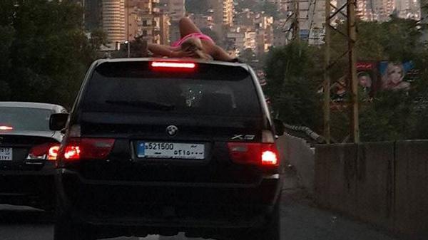 انتشرت صورة عبر مواقع التواصل الاجتماعي تظهر فيها فتاة ترتدي المايوه وتتمدد على ظهر سيارة على أوتوستراد جونية .
