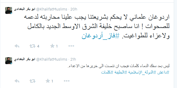 علق أبوبكر البغدادي زعيم تنظيم داعش على فوز رجب طيب أردوغان في تغريدة له على تويتر :" أردوغان علماني لا يحكم بشريعتنا يجب علينا محاربته لدعمه للصحوات".