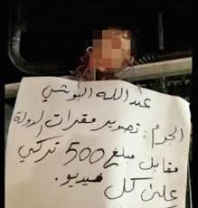وأفاد المرصد بأن شاباً ملتحياً ووجهه مدمى كان معلقاً الجمعة على عارضة معدنية، علقت معه لافتة كتب عليها بخط اليد: "عبدالله البوشي، الجرم: تصوير مقرات الدولة مقابل مبلغ 500 ليرة تركي لكل فيديو، الحكم: الردة، قتل وصلب لمدة 3 أيام".