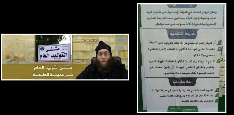 اعلن تنظيم "داعش" عبر نشره اعلانات على الطرقات عن افتتاحه كلية للطب في الرقة، داعيا الراغبين للانتساب إليها، مشترطا أن يكون عمر المتقدم بين 18 و 30 و حاصلاً على الشهادة الثانوية بفرعها العلمي وحاصلا على نسبة ثمانين في المئة او لمن لم يكمل دراسته ان يكون حاصلا على الشهادة الاعدادية بمعدل يفوق الثمانين في المئة حيث يجري امتحان تنافسي.