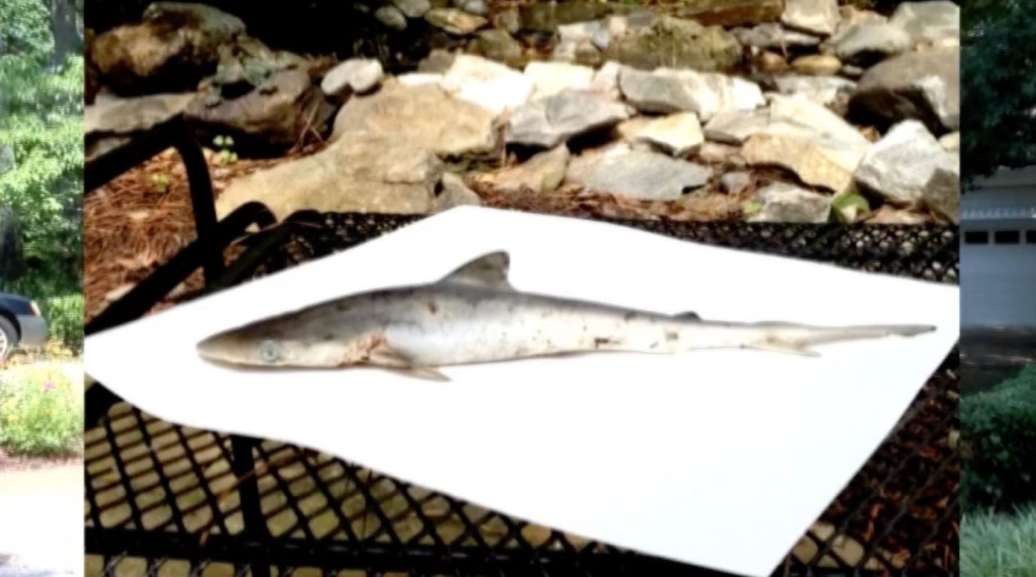 تقول سو باوسر صاحبة منزل في فيرجينيا إنها فوجئت عندما أخبرها أطفالها أنهم عثروا على سمكة قرش قرب منزلهم.