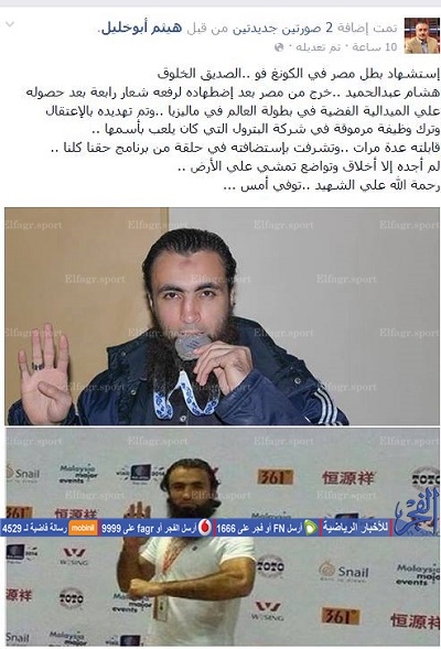 وكتب الإخواني هيثم أبو خليل عبر صفحته علي "فيسبوك" قائلا " إستشهاد بطل مصر في الكونغ فو ..الصديق الخلوق، هشام عبدالحميد ..خرج من مصر بعد إضطهاده لرفعه شعار رابعة بعد حصوله علي الميدالية الفضية في بطولة العالم في ماليزيا ..وتم تهديده بالإعتقال، وترك وظيفة مرموقة في شركة البترول التي كان يلعب بأسمها".