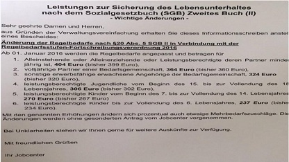 أرسلت السلطات الألمانية للاجئين الحاصلين على الإقامة في أراضيها ، نسخة من قرار مفاده أنه اعتباراً من 1/1/2016 سيتم زيادة راتب اللاجئ كالتالي: