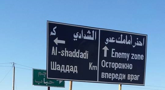 ونشر الزميل محمد حسن وهو صحفي يعمل ضمن قوات “سوريا الديمقراطية” من على تخوم مدينة الشدادي، صورة تظهر لافتة تعريف للمدينة مكتوبة باللغات الروسية، العربية والانكليزية.