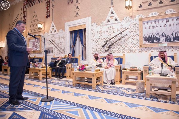 أستاذ رياض حجاب ..قارن بين صورتين فقط وحكم ضميرك و من ثم خذ قرارك..الصورة الأولى وهي قبل انشقاقك و خيانتك حين كنت رئيسا لمجلس الوزراء السوري .. ألم تكن سيد نفسك و سيد مجلسك..ألم يكن ضيوف دمشق ينحنون لعراقة يمثلها المقام الذي تشغله..والآن ألا ترى الوفود الأجنبية والعربية تتقاطر إلى دمشق كسباً للرضى..واليوم صورتك هذه وازدراء آل سعود من صوتك ( كما هو واضح في الصورة) يجعل منك صعلوكاً تافه..ليس في نظرهم ..بل في نظر كل سوري شريف..لا لشخصك فشخصك بات معروف..ولكن لمقام شغلته في يوم من الأيام واليوم دنسته .. لأن من يقرأ الصورة سيقول وقف رئيس الوزراء السوري "السابق" أمام آل سعود وقفة ذل و استرضاء..