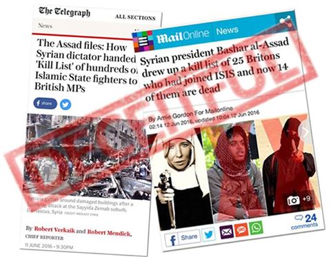نشر موقعكم الالكتروني (ميل اونلاين) موضوعاً بعنوان "الرئيس السوري بشار الأسد وضع قائمة قتل تضم 25 من البريطانيين الذين انضموا لداعش و14 منهم لقوا حتفهم حتى الآن"، بقلم إيمي غوردون بتاريخ 12/6/2016.