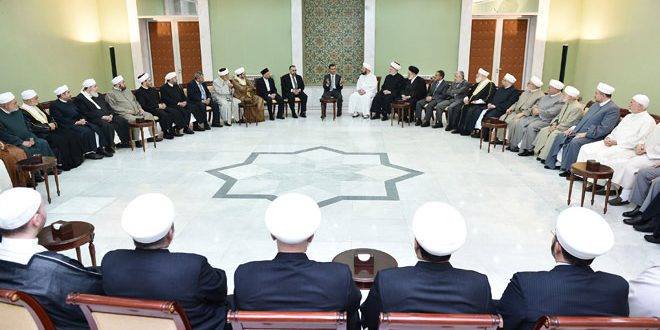 استقبل السيد الرئيس بشار الأسد اليوم وفدا من كبار علماء الدين الإسلامي بمناسبة شهر رمضان المبارك بحضور الدكتور محمد عبد الستار السيد وزير الأوقاف وسماحة المفتي العام الدكتور أحمد بدر الدين حسون.